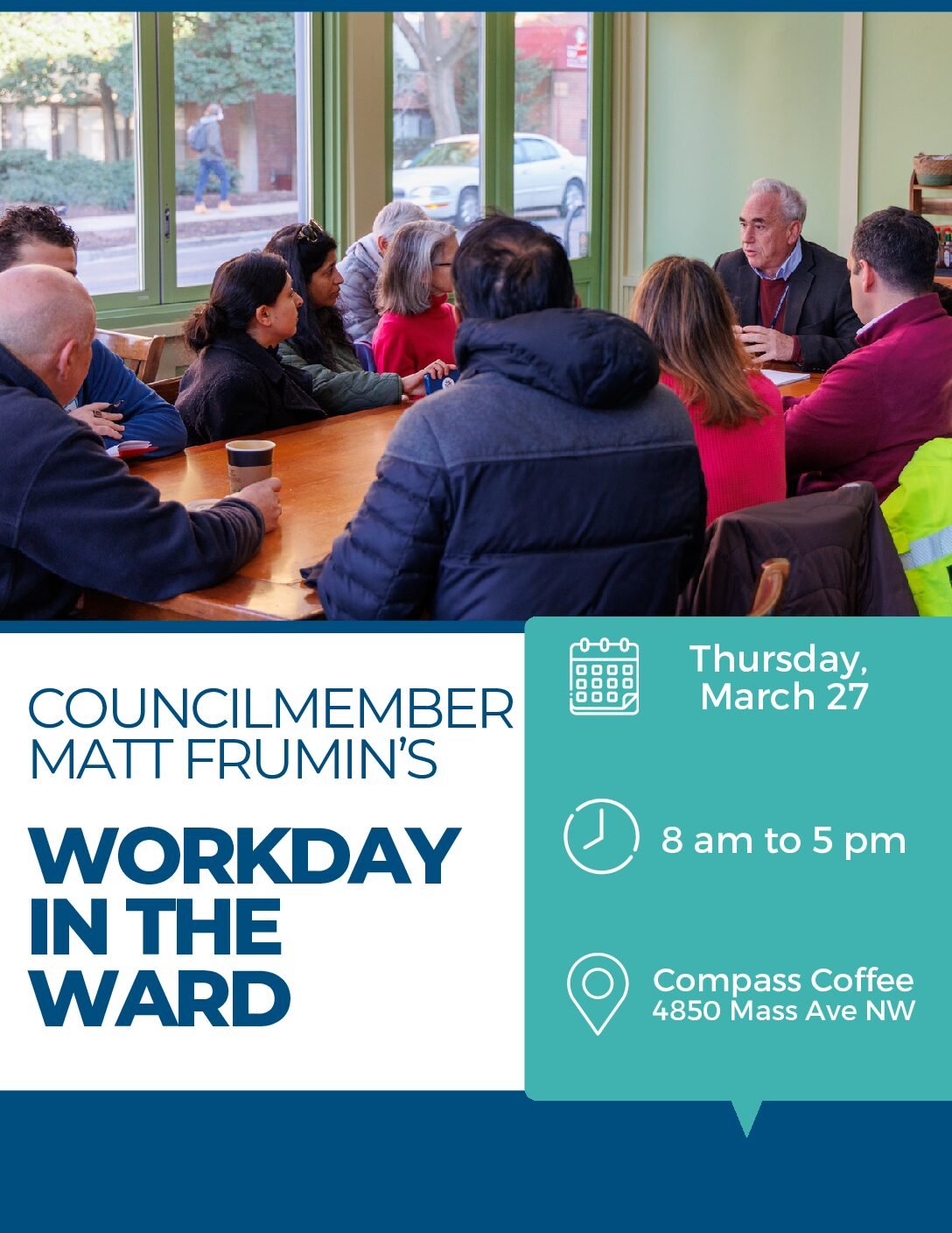 Our next Workday in the Ward will be in Spring Valley on Thursday, March 27, from 8:00 am to 5:00 pm at Compass Coffee, 4850 Massachusetts Ave NW, Washington, DC 20016. Come meet with Councilmember Frumin from 8:00 am to 10:00 am, or with staff and representatives from District government agencies throughout the day. These events bring our office to the ward for another opportunity for constituents to discuss legislation, receive services, and meet with issue experts. See the full schedule for the day below: